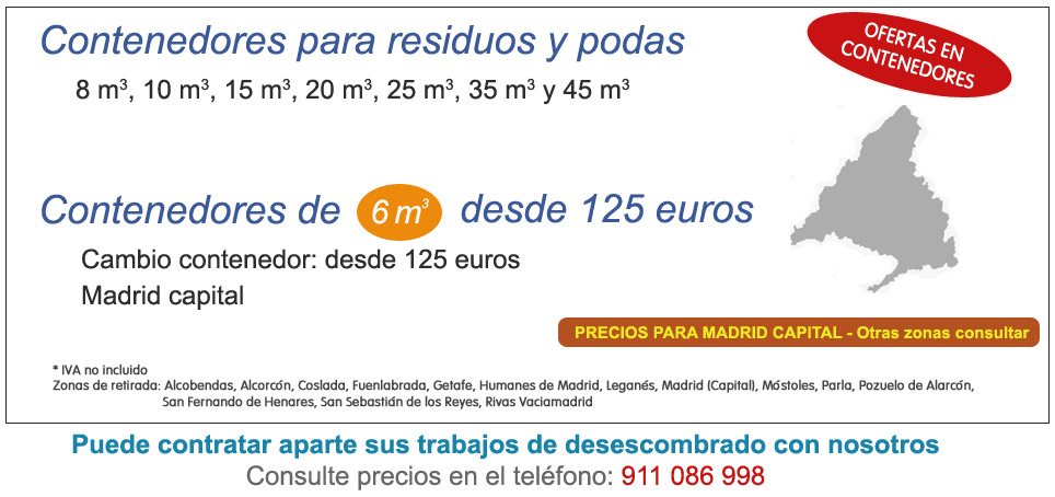 Alquilamos y transportamos contenedores de escombros en toda la Comunidad de Madrid. Tenemos unos precios inmejorables, no deje de contactarnos para solicitar un presupuesto y utilice uno de nuestros contenedores para los escombros de todo tipo de obras y reformas de viviendas, pisos, locales, oficinas...